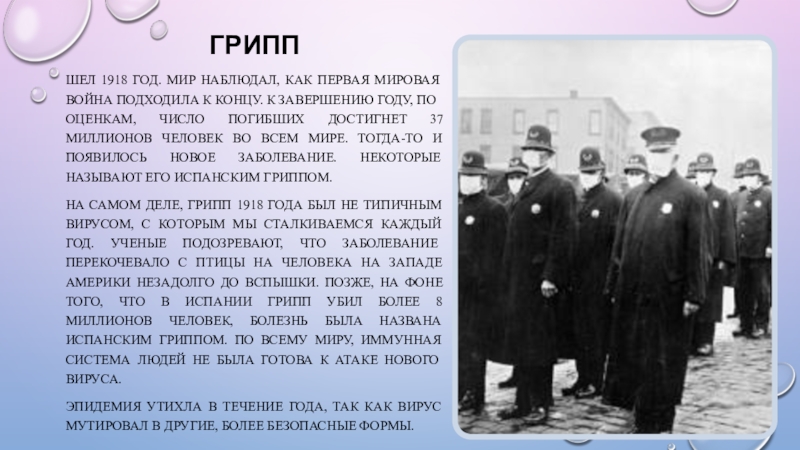 концу. К завершению году, по оценкам, число погибших достигнет 37 миллионов человек во всем мире. Тогда-то и появилось новое заболевание. Некоторые называют его испанским гриппом.