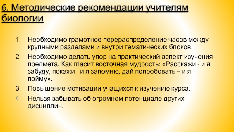 Необходимо делать упор на практический аспект изучения предмета. Как гласит восточная мудрость: «Расскажи - и я забуду, покажи - и я запомню, дай попробовать – и я пойму».