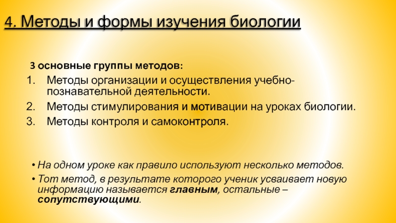 Тот метод, в результате которого ученик усваивает новую информацию называется главным, остальные – сопутствующими.
