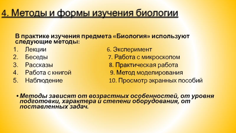 Методы зависят от возрастных особенностей, от уровня подготовки, характера и степени оборудования, от поставленных задач.