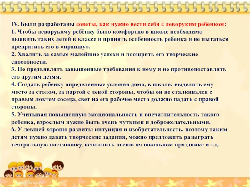 3.Праворуких выявлено 16 человек, количество мальчиков и девочек одинаковое по 8 человек Чистых правшей- 8 человек, также количество мальчиков и девочек одинаковое.