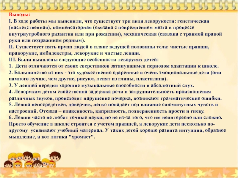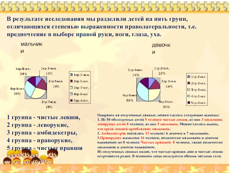 1. Из 50 обследуемых детей 5 человек чистые левши, из них 3 мальчики; леворуких детей 8 человек, из них 5 мальчики. Можно сделать вывод, что среди левшей преобладают мальчики.