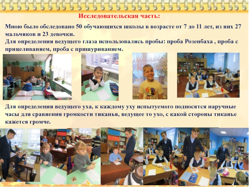 Для определения ведущего уха, к каждому уху испытуемого подносятся наручные часы для сравнения громкости тиканья, ведущее то ухо, с какой стороны тиканье кажется громче.