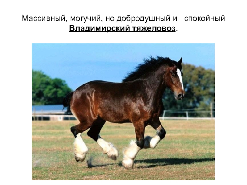 Слайд 9Массивный, могучий, но добродушный и спокойный Владимирский тяжеловоз.