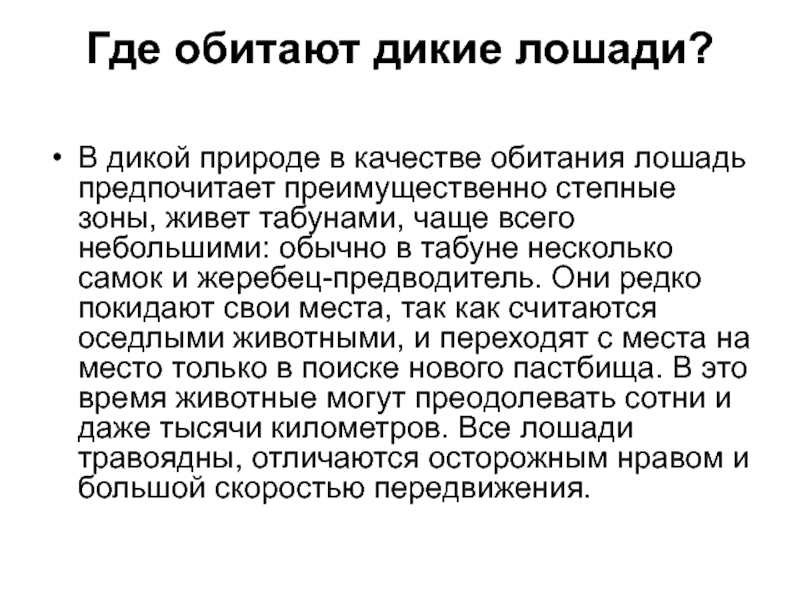 преимущественно степные зоны, живет табунами, чаще всего небольшими: обычно в табуне несколько самок и жеребец-предводитель. Они редко покидают свои места, так как считаются оседлыми животными, и переходят с места на место только в поиске нового пастбища. В это время животные могут преодолевать сотни и даже тысячи километров. Все лошади травоядны, отличаются осторожным нравом и большой скоростью передвижения.