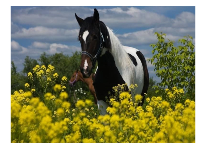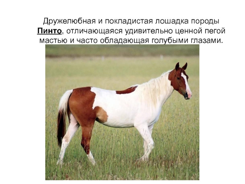 Слайд 7Дружелюбная и покладистая лошадка породы Пинто, отличающаяся удивительно ценной пегой мастью