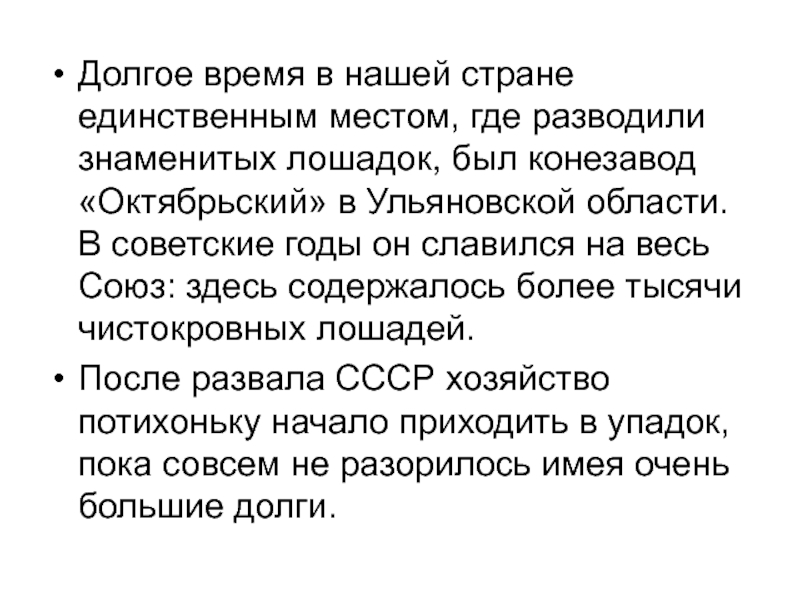 был конезавод «Октябрьский» в Ульяновской области. В советские годы он славился на весь Союз: здесь содержалось более тысячи чистокровных лошадей.