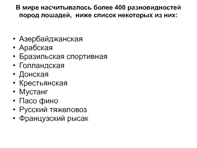 Слайд 17В мире насчитывалось более 400 разновидностей пород лошадей, ниже список некоторых