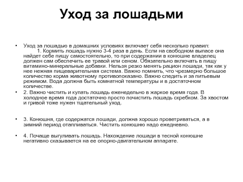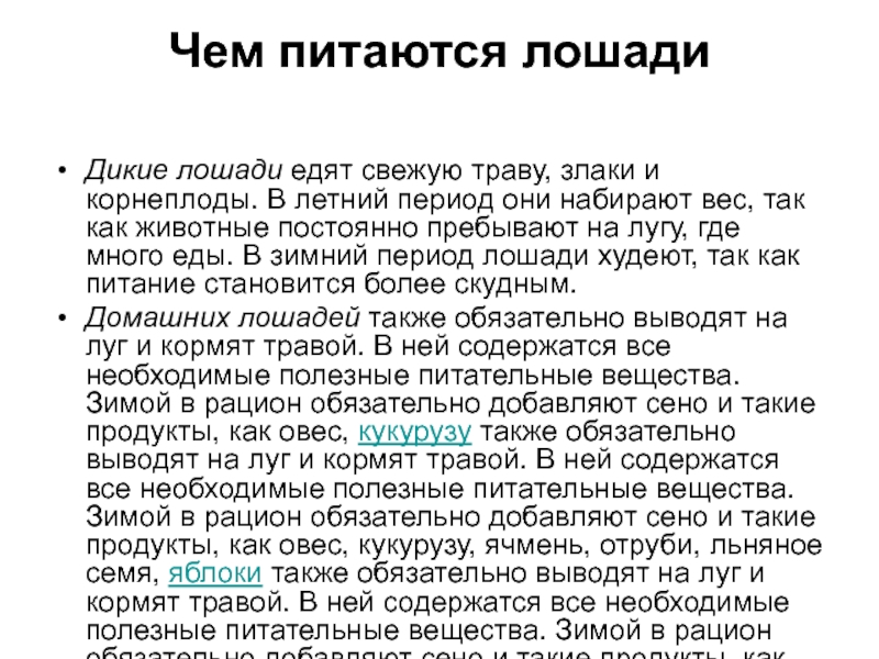 Домашних лошадей также обязательно выводят на луг и кормят травой. В ней содержатся все необходимые полезные питательные вещества. Зимой в рацион обязательно добавляют сено и такие продукты, как овес, кукурузу также обязательно выводят на луг и кормят травой. В ней содержатся все необходимые полезные питательные вещества. Зимой в рацион обязательно добавляют сено и такие продукты, как овес, кукурузу, ячмень, отруби, льняное семя, яблоки также обязательно выводят на луг и кормят травой. В ней содержатся все необходимые полезные питательные вещества. Зимой в рацион обязательно добавляют сено и такие продукты, как овес, кукурузу, ячмень, отруби, льняное семя, яблоки, морковь также обязательно выводят на луг и кормят травой. В ней содержатся все необходимые полезные питательные вещества. Зимой в рацион обязательно добавляют сено и такие продукты, как овес, кукурузу, ячмень, отруби, льняное семя, яблоки, морковь, свеклу и картофель. Если в корме лошади содержится недостаточное количество питательных веществ, животное начнет худеть, и внешний вид лошади будет ухудшаться.