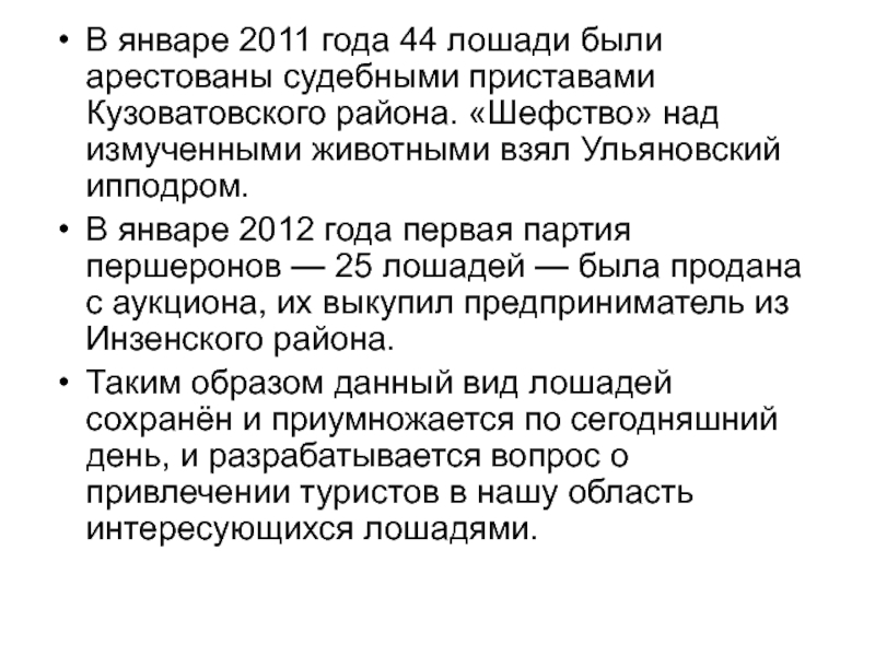 В январе 2011 года 44 лошади были арестованы судебными приставами Кузоватовского