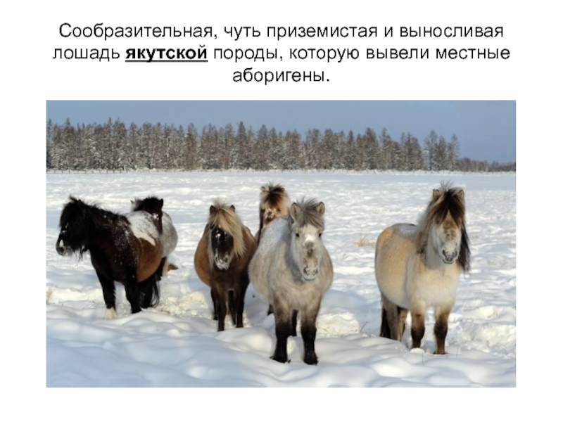Слайд 8Сообразительная, чуть приземистая и выносливая лошадь якутской породы, которую вывели местные