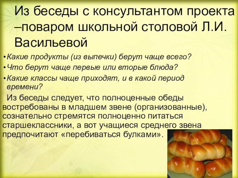 Слайд 16Из беседы с консультантом проекта –поваром школьной столовой Л.И. Васильевой