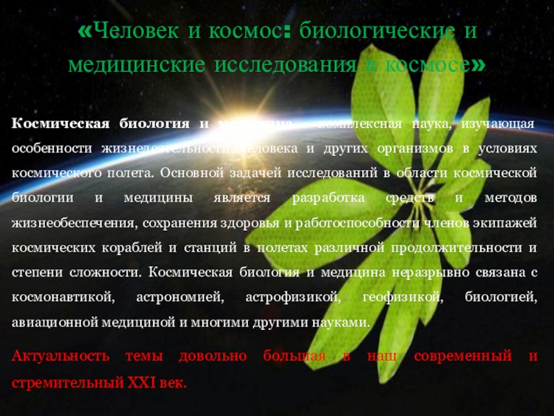 Слайд 2«Человек и космос: биологические и медицинские исследования в космосе»
