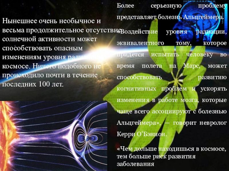 «Воздействие уровня радиации, эквивалентного тому, которое придется испытать человеку во время полета на Марс, может способствовать развитию когнитивных проблем и ускорять изменения в работе мозга, которые чаще всего ассоциируют с болезнью Альцгеймера», — говорит невролог Керри О’Бэнион.