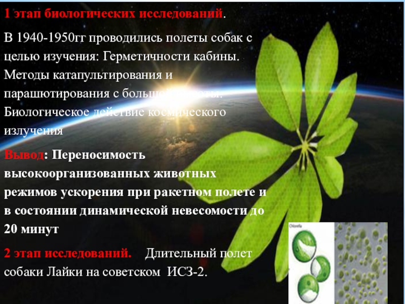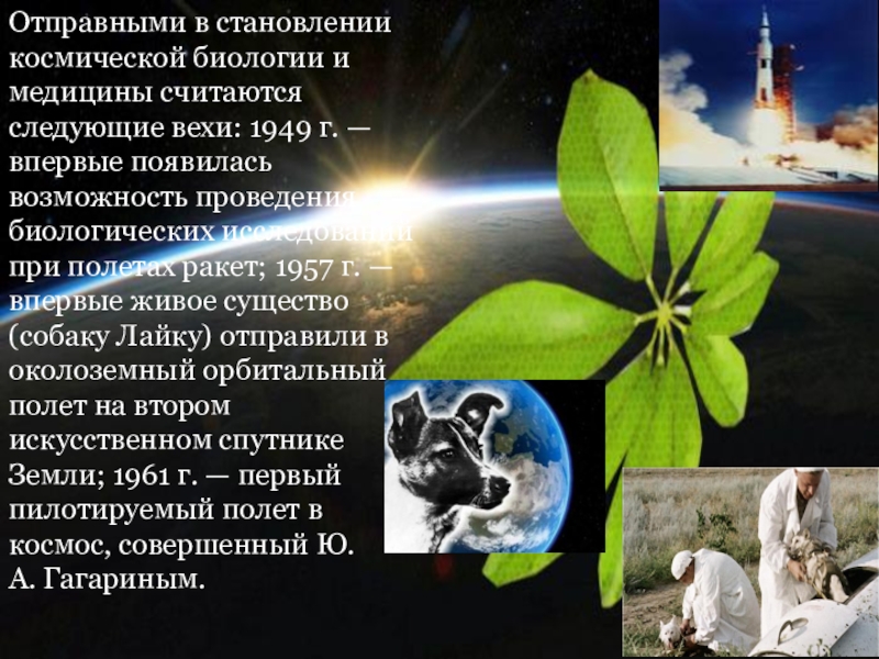 впервые появилась возможность проведения биологических исследований при полетах ракет; 1957 г. — впервые живое существо (собаку Лайку) отправили в околоземный орбитальный полет на втором искусственном спутнике Земли; 1961 г. — первый пилотируемый полет в космос, совершенный Ю. А. Гагариным.