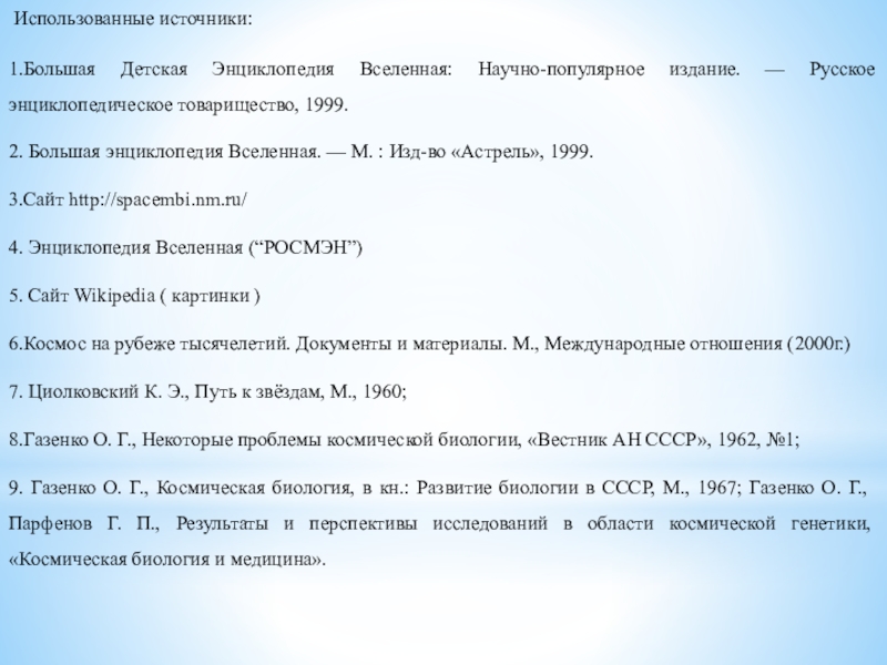 8.Газенко О. Г., Некоторые проблемы космической биологии, «Вестник АН СССР», 1962, №1;