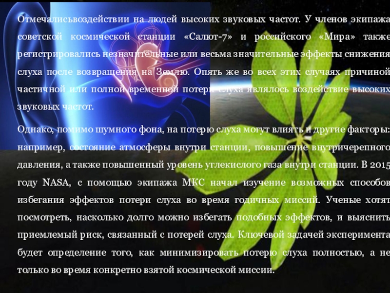 станции «Салют-7» и российского «Мира» также регистрировались незначительные или весьма значительные эффекты снижения слуха после возвращения на Землю. Опять же во всех этих случаях причиной частичной или полной временной потери слуха являлось воздействие высоких звуковых частот.