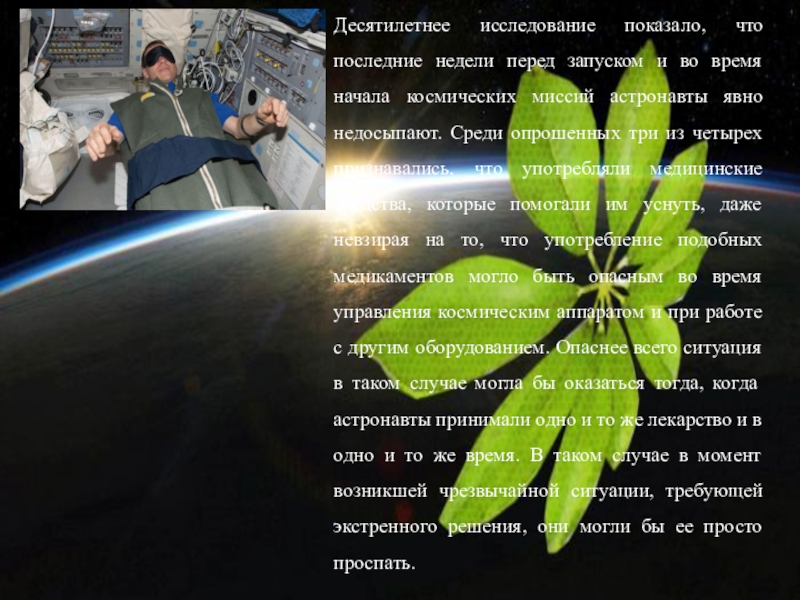 начала космических миссий астронавты явно недосыпают. Среди опрошенных три из четырех признавались, что употребляли медицинские средства, которые помогали им уснуть, даже невзирая на то, что употребление подобных медикаментов могло быть опасным во время управления космическим аппаратом и при работе с другим оборудованием. Опаснее всего ситуация в таком случае могла бы оказаться тогда, когда астронавты принимали одно и то же лекарство и в одно и то же время. В таком случае в момент возникшей чрезвычайной ситуации, требующей экстренного решения, они могли бы ее просто проспать.