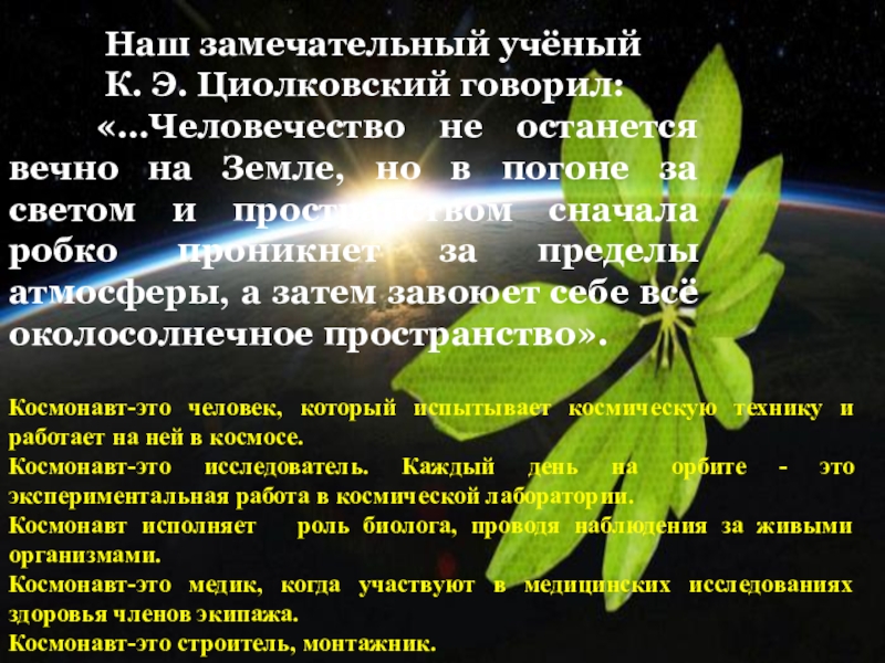 «…Человечество не останется вечно на Земле, но в погоне за светом и пространством сначала робко проникнет за пределы атмосферы, а затем завоюет себе всё околосолнечное пространство».