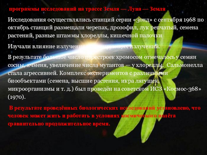 В результате большое число перестроек хромосом отмечалось у семян сосны, ячменя, увеличение числа мутантов — у хлореллы. Сальмонелла стала агрессивней. Комплекс экспериментов с различными биообъектами (семена, высшие растения, икра лягушек, микроорганизмы и т. д.) был проведён на советском ИСЗ «Космос-368» (1970).