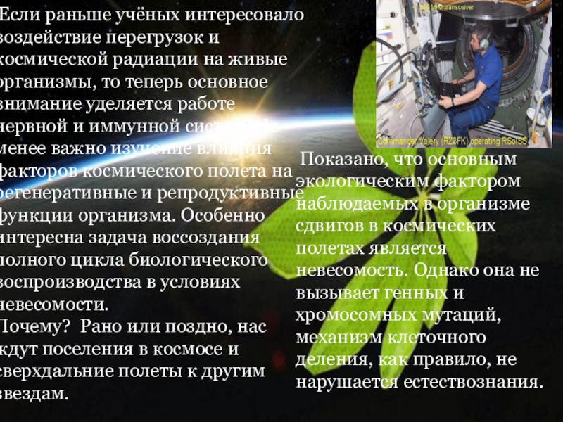 Слайд 5 Если раньше учёных интересовало воздействие перегрузок и космической радиации на