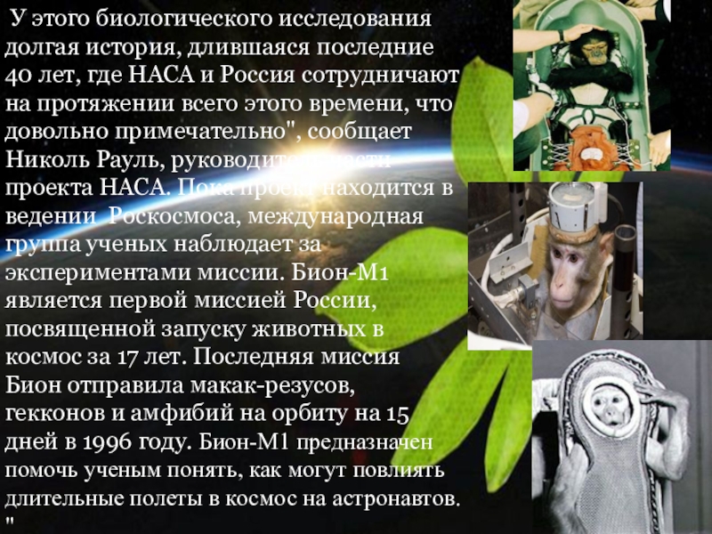 где НАСА и Россия сотрудничают на протяжении всего этого времени, что довольно примечательно", сообщает Николь Рауль, руководитель части проекта НАСА. Пока проект находится в ведении Роскосмоса, международная группа ученых наблюдает за экспериментами миссии. Бион-М1 является первой миссией России, посвященной запуску животных в космос за 17 лет. Последняя миссия Бион отправила макак-резусов, гекконов и амфибий на орбиту на 15 дней в 1996 году. Бион-М1 предназначен помочь ученым понять, как могут повлиять длительные полеты в космос на астронавтов. "