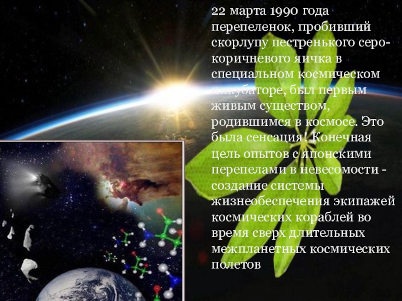 специальном космическом инкубаторе, был первым живым существом, родившимся в космосе. Это была сенсация! Конечная цель опытов с японскими перепелами в невесомости - создание системы жизнеобеспечения экипажей космических кораблей во время сверх длительных межпланетных космических полетов