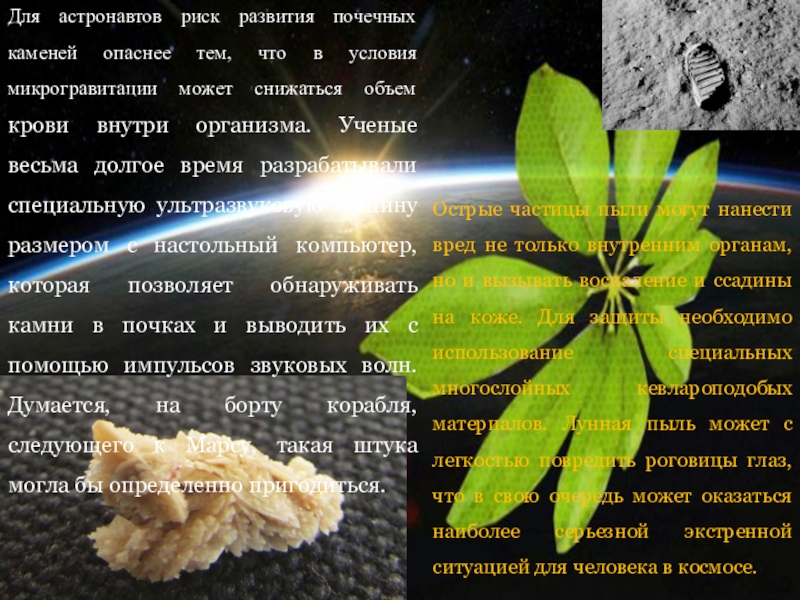 Слайд 14Для астронавтов риск развития почечных каменей опаснее тем, что в условия