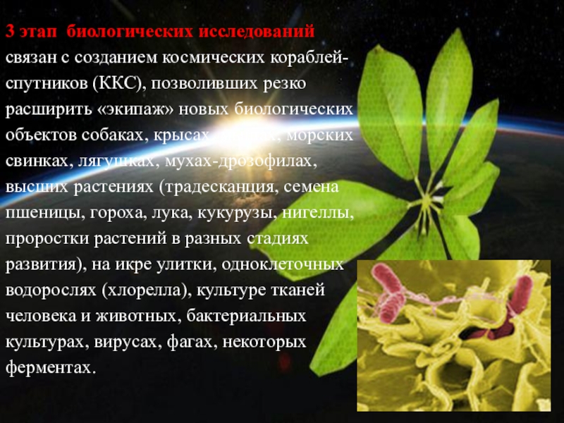 резко расширить «экипаж» новых биологических объектов собаках, крысах, мышах, морских свинках, лягушках, мухах-дрозофилах, высших растениях (традесканция, семена пшеницы, гороха, лука, кукурузы, нигеллы, проростки растений в разных стадиях развития), на икре улитки, одноклеточных водорослях (хлорелла), культуре тканей человека и животных, бактериальных культурах, вирусах, фагах, некоторых ферментах.