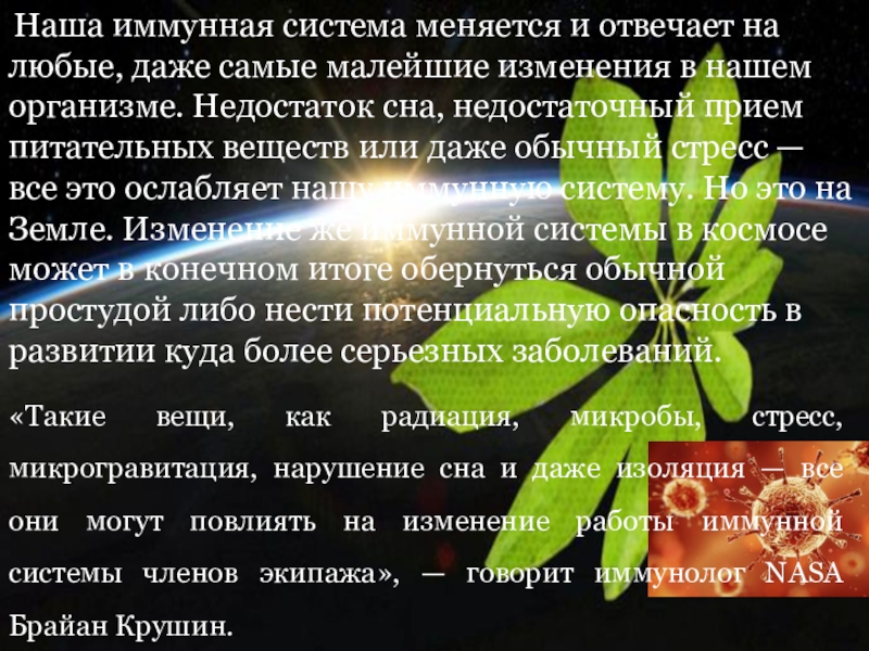 малейшие изменения в нашем организме. Недостаток сна, недостаточный прием питательных веществ или даже обычный стресс — все это ослабляет нашу иммунную систему. Но это на Земле. Изменение же иммунной системы в космосе может в конечном итоге обернуться обычной простудой либо нести потенциальную опасность в развитии куда более серьезных заболеваний.