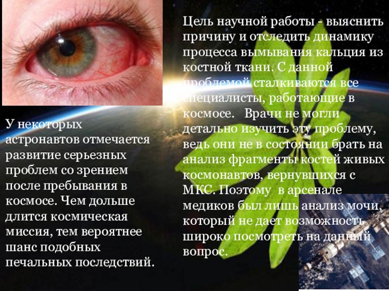 Слайд 17У некоторых астронавтов отмечается развитие серьезных проблем со зрением после пребывания
