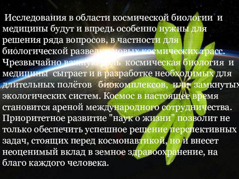 особенно нужны для решения ряда вопросов, в частности для биологической разведки новых космических трасс. Чрезвычайно важную роль космическая биология и медицины сыграет и в разработке необходимых для длительных полётов биокомплексов, или замкнутых экологических систем. Космос в настоящее время становится ареной международного сотрудничества. Приоритетное развитие "наук о жизни" позволит не только обеспечить успешное решение перспективных задач, стоящих перед космонавтикой, но и внесет неоценимый вклад в земное здравоохранение, на благо каждого человека.