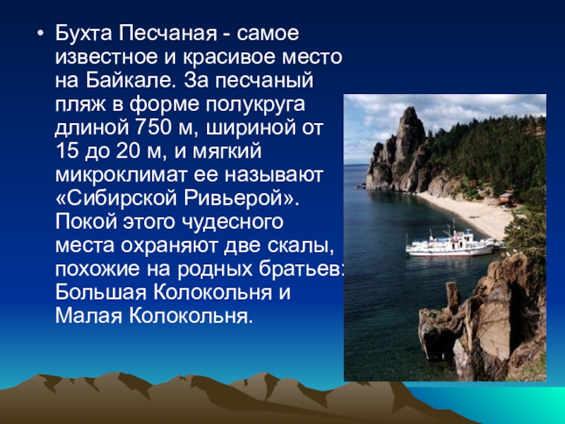 Слайд 3Бухта Песчаная - самое известное и красивое место на Байкале. За