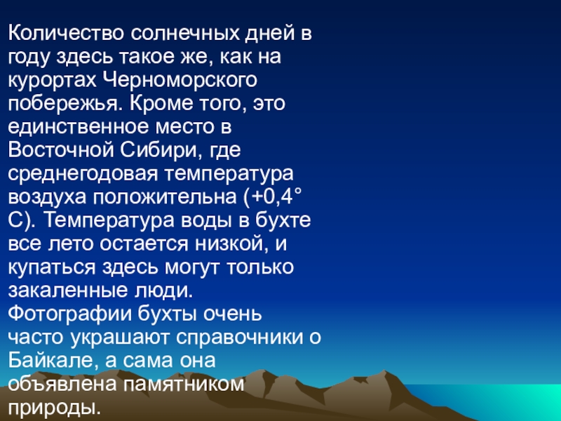 Черноморского побережья. Кроме того, это единственное место в Восточной Сибири, где среднегодовая температура воздуха положительна (+0,4°С). Температура воды в бухте все лето остается низкой, и купаться здесь могут только закаленные люди.