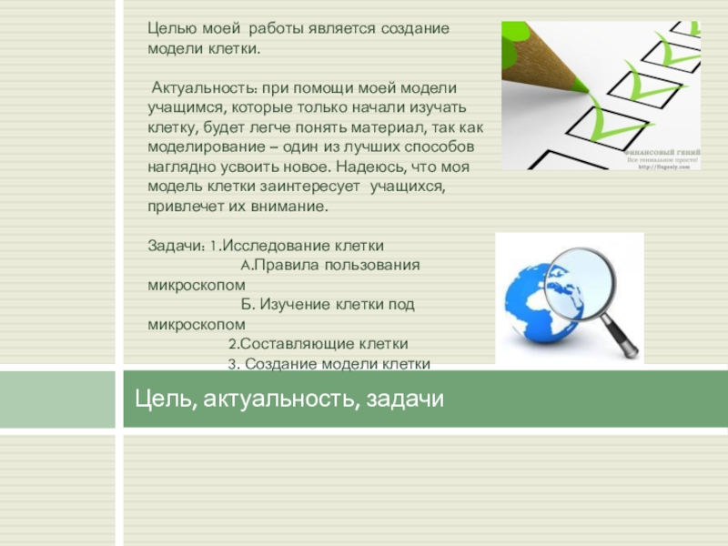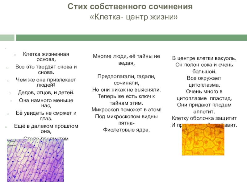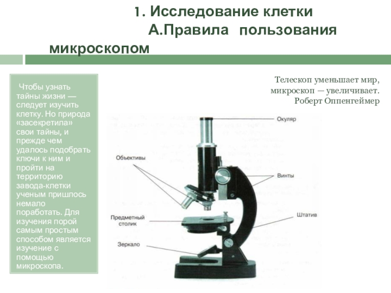 Чтобы узнать тайны жизни — следует изучить клетку. Но природа «засекретила» свои тайны, и прежде чем удалось подобрать ключи к ним и пройти на территорию завода-клетки ученым пришлось немало поработать. Для изучения порой самым простым способом является изучение с помощью микроскопа.