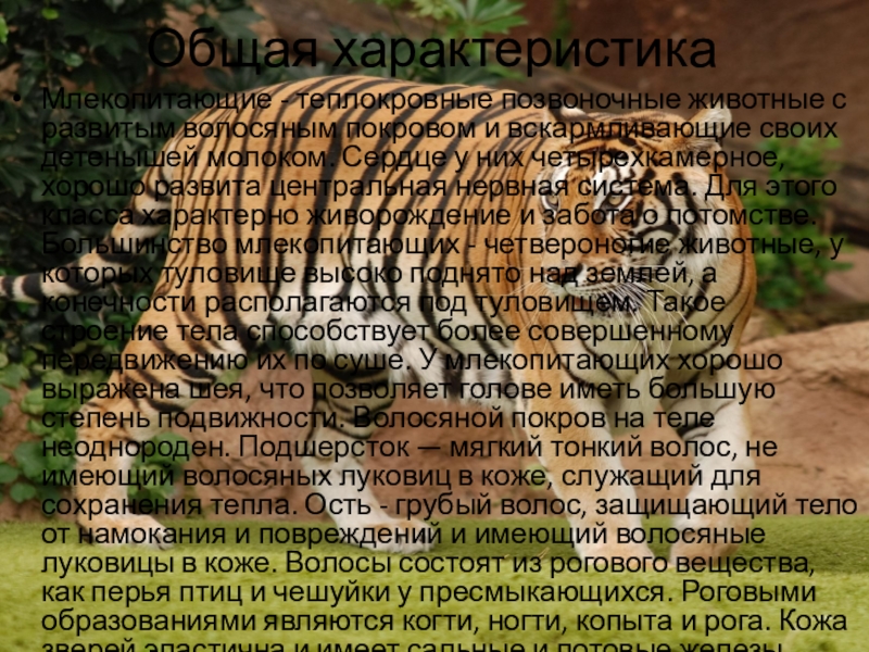 и вскармливающие своих детенышей молоком. Сердце у них четырехкамерное, хорошо развита центральная нервная система. Для этого класса характерно живорождение и забота о потомстве. Большинство млекопитающих - четвероногие животные, у которых туловище высоко поднято над землей, а конечности располагаются под туловищем. Такое строение тела способствует более совершенному передвижению их по суше. У млекопитающих хорошо выражена шея, что позволяет голове иметь большую степень подвижности. Волосяной покров на теле неоднороден. Подшерсток — мягкий тонкий волос, не имеющий волосяных луковиц в коже, служащий для сохранения тепла. Ость - грубый волос, защищающий тело от намокания и повреждений и имеющий волосяные луковицы в коже. Волосы состоят из рогового вещества, как перья птиц и чешуйки у пресмыкающихся. Роговыми образованиями являются когти, ногти, копыта и рога. Кожа зверей эластична и имеет сальные и потовые железы.