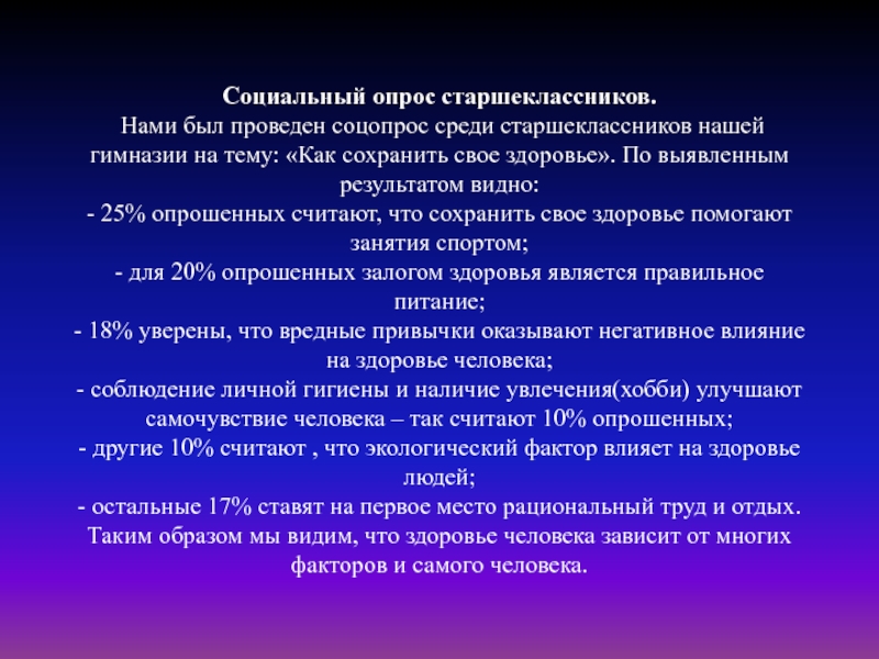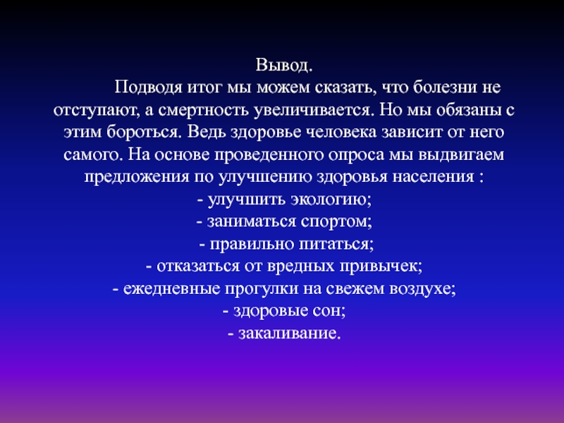Подводя итог мы можем сказать, что болезни не отступают, а смертность увеличивается. Но мы обязаны с этим бороться. Ведь здоровье человека зависит от него самого. На основе проведенного опроса мы выдвигаем предложения по улучшению здоровья населения :