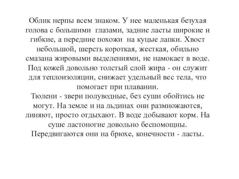 Слайд 8Облик нерпы всем знаком. У нее маленькая безухая голова с большими