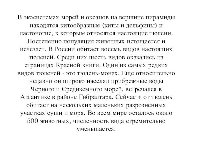 и дельфины) и ластоногие, к которым относятся настоящие тюлени. Постепенно популяция животных истощается и исчезает. В России обитает восемь видов настоящих тюленей. Среди них шесть видов оказались на страницах Красной книги. Один из самых редких видов тюленей - это тюлень-монах. Еще относительно недавно он широко населял прибрежные воды Черного и Средиземного морей, встречался в Атлантике в районе Гибралтара. Сейчас этот тюлень обитает на нескольких маленьких разрозненных участках суши и моря. Во всем мире осталось около 500 животных, численность вида стремительно уменьшается.