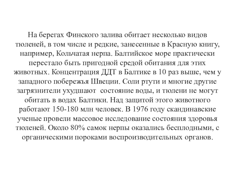 и редкие, занесенные в Красную книгу, например, Кольчатая нерпа. Балтийское море практически перестало быть пригодной средой обитания для этих животных. Концентрация ДДТ в Балтике в 10 раз выше, чем у западного побережья Швеции. Соли ртути и многие другие загрязнители ухудшают состояние воды, и тюлени не могут обитать в водах Балтики. Над защитой этого животного работают 150-180 млн человек. В 1976 году скандинавские ученые провели массовое исследование состояния здоровья тюленей. Около 80% самок нерпы оказались бесплодными, с органическими пороками воспроизводительных органов.