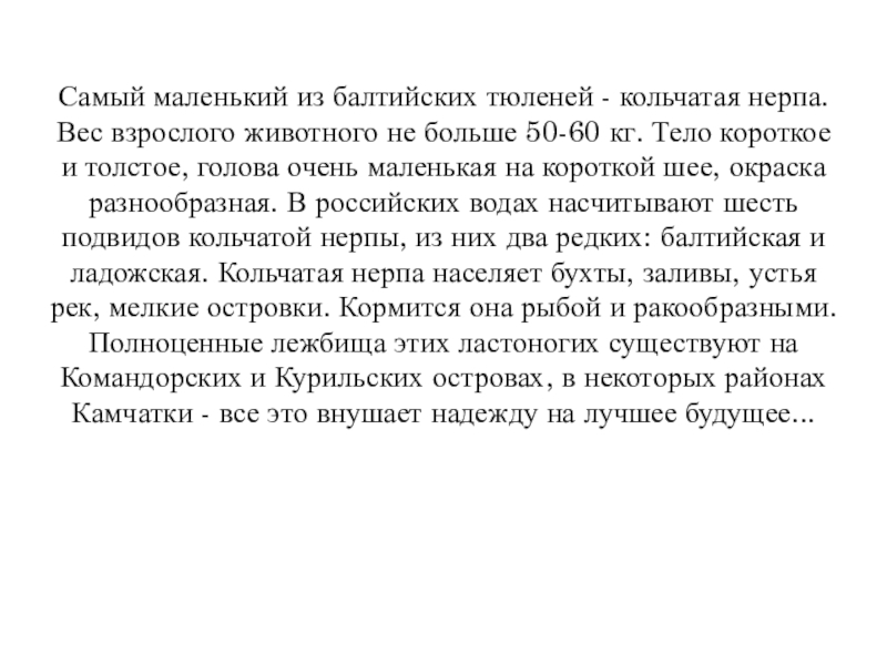 не больше 50-60 кг. Тело короткое и толстое, голова очень маленькая на короткой шее, окраска разнообразная. В российских водах насчитывают шесть подвидов кольчатой нерпы, из них два редких: балтийская и ладожская. Кольчатая нерпа населяет бухты, заливы, устья рек, мелкие островки. Кормится она рыбой и ракообразными. Полноценные лежбища этих ластоногих существуют на Командорских и Курильских островах, в некоторых районах Камчатки - все это внушает надежду на лучшее будущее...