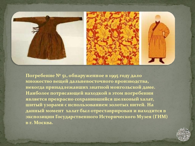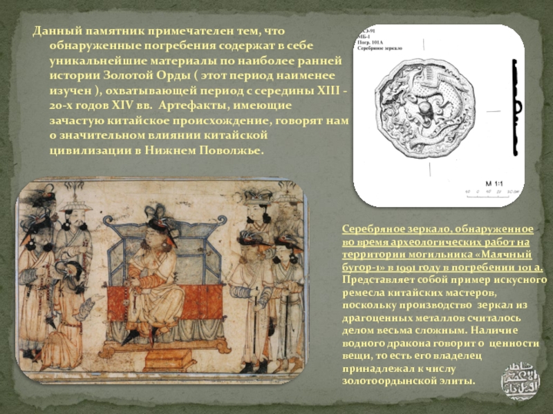 Серебряное зеркало, обнаруженное во время археологических работ на территории могильника «Маячный бугор-1» в 1991 году в погребении 101 а. Представляет собой пример искусного ремесла китайских мастеров, поскольку производство зеркал из драгоценных металлов считалось делом весьма сложным. Наличие водного дракона говорит о ценности вещи, то есть его владелец принадлежал к числу золотоордынской элиты.