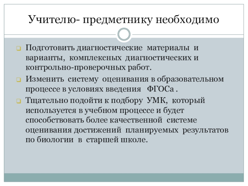 Тщательно подойти к подбору УМК, который используется в учебном процессе и будет способствовать более качественной системе оценивания достижений планируемых результатов по биологии в старшей школе.