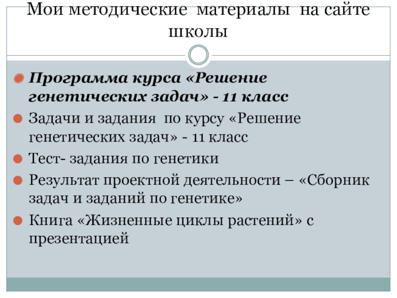 Элективный курс - Решение биологических задач по учебному модулю «Жизненные циклы, или общие закономерности онтогенеза организмов». И.П. Чередниченко – I полугодие. Решение генетических задач– II полугодие.