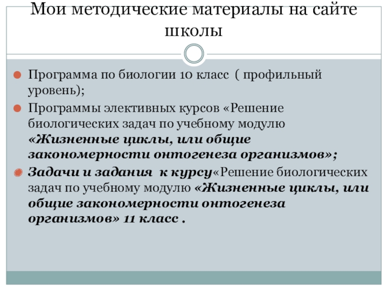 Программы элективных курсов «Решение биологических задач по учебному модулю «Жизненные циклы, или общие закономерности онтогенеза организмов»;