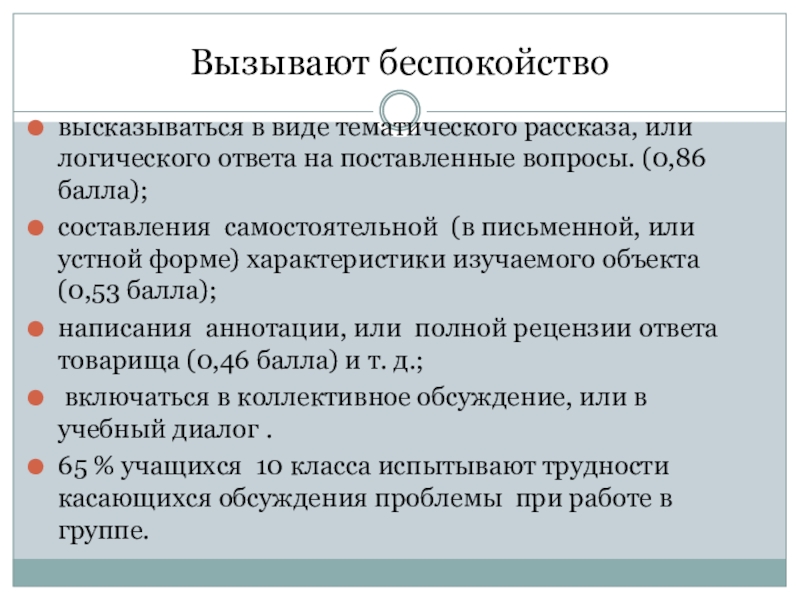 65 % учащихся 10 класса испытывают трудности касающихся обсуждения проблемы при работе в группе.