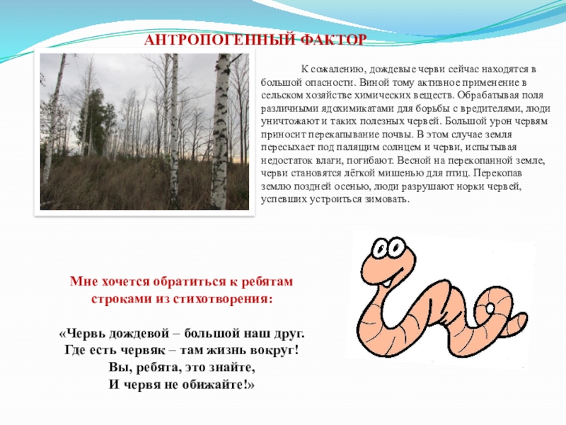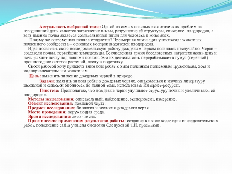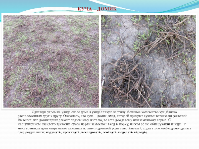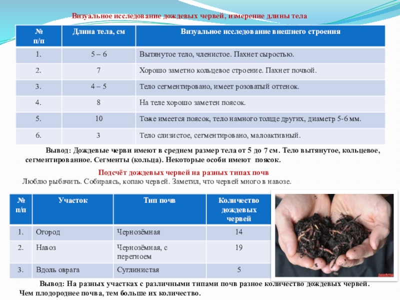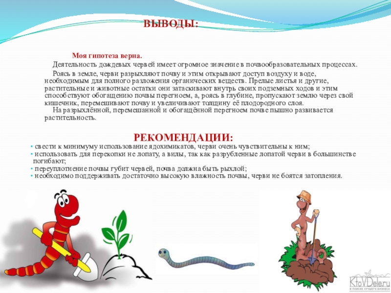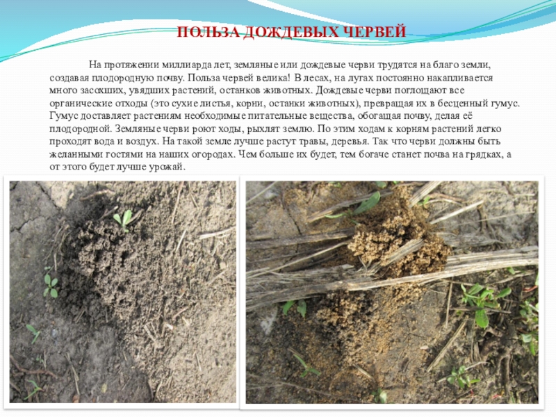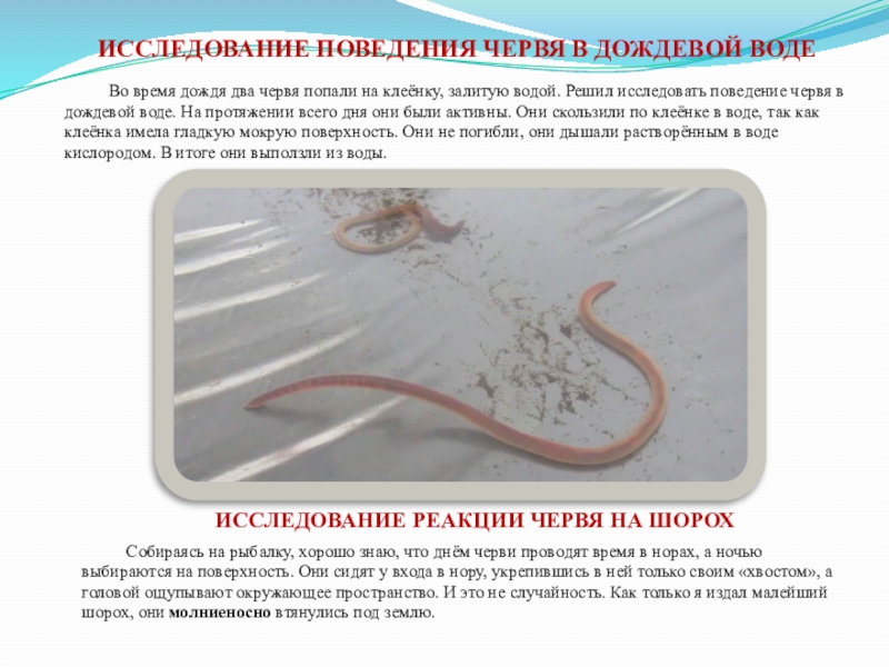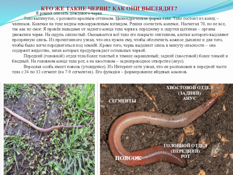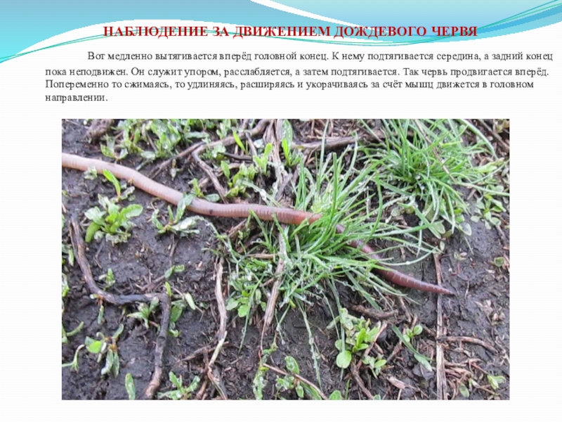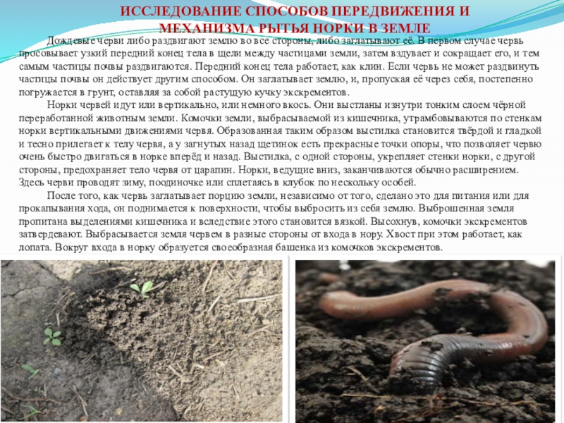 её. В первом случае червь просовывает узкий передний конец тела в щели между частицами земли, затем вздувает и сокращает его, и тем самым частицы почвы раздвигаются. Передний конец тела работает, как клин. Если червь не может раздвинуть частицы почвы он действует другим способом. Он заглатывает землю, и, пропуская её через себя, постепенно погружается в грунт, оставляя за собой растущую кучку экскрементов.