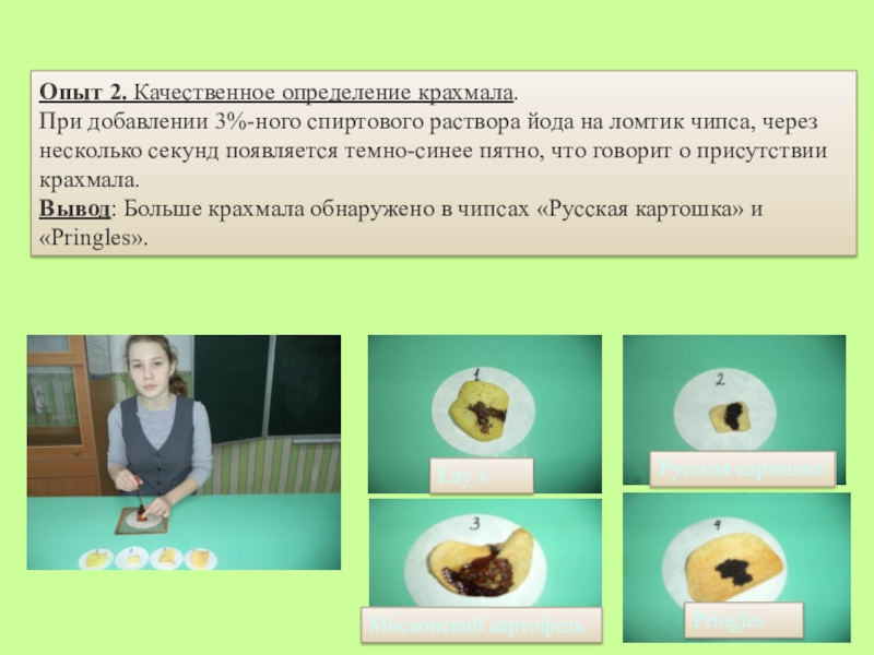 Вывод: Больше крахмала обнаружено в чипсах «Русская картошка» и «Pringles».