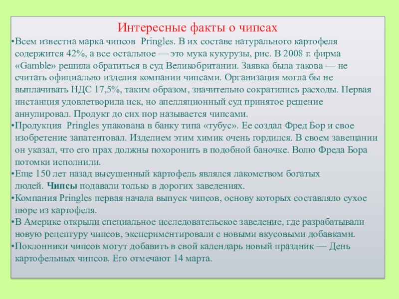 натурального картофеля содержится 42%, а все остальное — это мука кукурузы, рис. В 2008 г. фирма «Gamble» решила обратиться в суд Великобритании. Заявка была такова — не считать официально изделия компании чипсами. Организация могла бы не выплачивать НДС 17,5%, таким образом, значительно сократились расходы. Первая инстанция удовлетворила иск, но апелляционный суд принятое решение аннулировал. Продукт до сих пор называется чипсами.