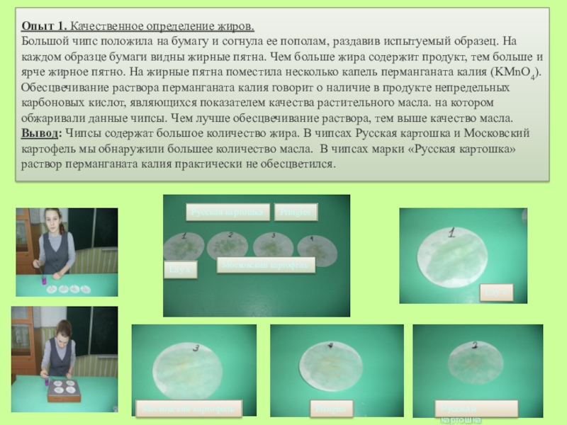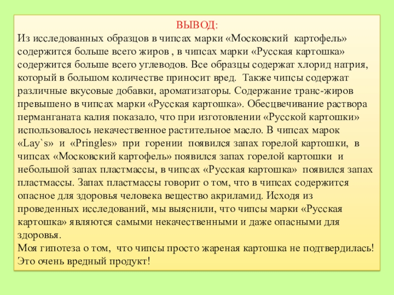 всего жиров , в чипсах марки «Русская картошка» содержится больше всего углеводов. Все образцы содержат хлорид натрия, который в большом количестве приносит вред. Также чипсы содержат различные вкусовые добавки, ароматизаторы. Содержание транс-жиров превышено в чипсах марки «Русская картошка». Обесцвечивание раствора перманганата калия показало, что при изготовлении «Русской картошки» использовалось некачественное растительное масло. В чипсах марок «Lay`s» и «Pringles» при горении появился запах горелой картошки, в чипсах «Московский картофель» появился запах горелой картошки и небольшой запах пластмассы, в чипсах «Русская картошка» появился запах пластмассы. Запах пластмассы говорит о том, что в чипсах содержится опасное для здоровья человека вещество акриламид. Исходя из проведенных исследований, мы выяснили, что чипсы марки «Русская картошка» являются самыми некачественными и даже опасными для здоровья.